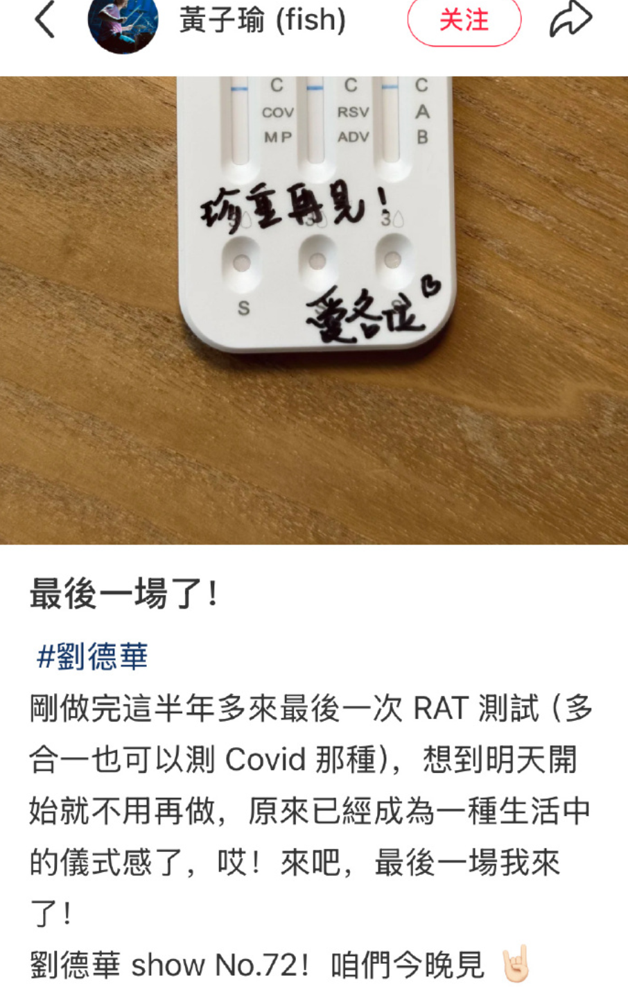 他发出自己检测试纸,上面除了写自己的名字外,他还写上了“珍重再见!爱各位”,演唱会的这半年,他们每天都要做检测、包括刘德华在内都持续戴口罩,一直到最后一场结束后,刘德华终于可以摘下口罩和大家互动。